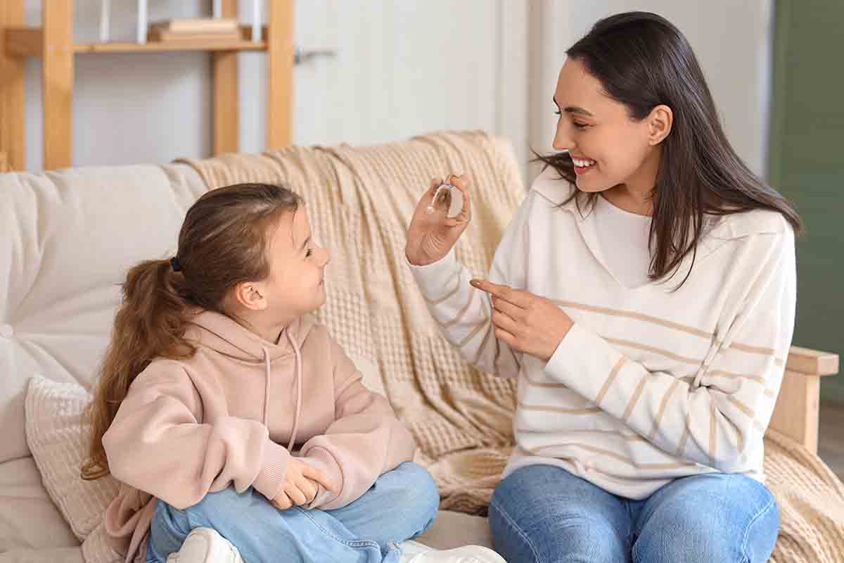 Mother showing hearing aid to her little daughter on sofa at hom